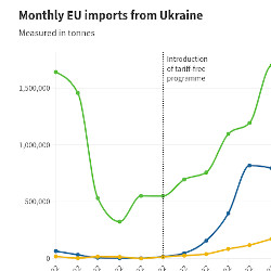 Uporedo sa tim, EU je odlučila da suspenduje carine i kvote na dugačkoj listi ukrajinskog izvoza namenjenog bloku, uključujući mnoge poljoprivredne proizvode, u pokušaju da pomogne ratom razorenoj zemlji da se izbori sa ekonomskim posledicama rata i olakša trgovinu za ukrajinske farmere.